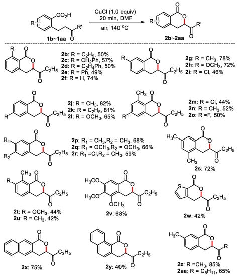 With the optimum reaction conditions in hand, the application of this method was investigated with a series of substituted 2-(3-oxobutyl) benzoic acids. The results are listed in Figure 2 and Figure 3. As can be seen from Figure 2, substituted 2-(3-oxo-amyl) benzoic acids bearing electron-donating groups at ortho-position of carboxyl such as ethyl, phenyl, benzyl, and ethylphenyl delivered moderate yields (2b–2e, 49–57%), and the yield was 74% when there was no substituted group in the benzene ring. Meta- and para-substituted 2-(3-oxamyl) benzoic acids such as 3-methyl, 3-methoxy, 4-methyl, and 4-ethyl, afforded good to excellent yields of cyclization products (2g–2l). 3-Cl-substituted 2-(3-oxamyl) benzoic acid also produced the targeted product (2i) in a 46% yield. Disubstituted 2-(3-oxopentyl) benzoic acids were also compatible, giving rise to moderate to good yields (2m–2u, 44–68%). 3,4,5-Trimethoxy-2-(3-oxamyl) benzoic acid gave 68% yield of 2v. When the benzene ring was substituted by thiophene, the yield was 42% (2w). Employing 3-(3-oxo-amyl)-2-naphthylformic acid and 2-(3-oxo-amyl)-2-naphthylformic acid as substrates, the cyclization products were 72% and 40%, respectively (2x and 2y). 5-Methyl-2-(3-oxobutyl) benzoic acid and 5-methyl-2-(3-oxooctyl) benzoic acid generated 85% and 65% desired products, respectively (2z and 2aa).