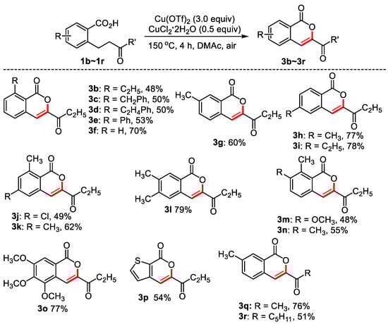 As can be seen from Figure 3, the oxidative dehydrogenation of 2-(3-oxopentyl) benzoic acids bearing different substituents produced isocoumarins in moderate to good yields. Similar to the formation of dihydroisocoumarins, donating groups at the ortho, meta, and para-position of carboxyl, 2,3-disubstituted 2-(3-oxo-amyl) benzoic acid, 2,4-disubstituted 2-(3-oxo-amyl) benzoic acid, 3,4-disubstituted 2-(3-oxo-amyl) benzoic acid worked well, and moderate to good yields were obtained (3b–3n). 3,4,5-Trimethoxy-2-(3-oxamyl) benzoic acid delivered 77% yield of targeted product. For heterocyclic 3-(3-oxopentyl) thiophene-2-carboxylic acid, 54% of product was observed. 76% and 51% of the isocoumarins were obtained from 3-methyl-2-(3oxobutyl) benzoic acid and 3-methyl-2-(3oxo-octyl) benzoic acid, respectively.