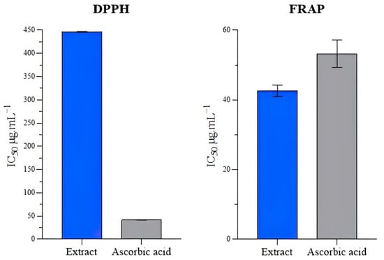 The results showed that the extract had an IC50 value of 446.136 ± 0.902 µg·mL−1, which was lower than that of ascorbic acid (41.553 ± 0.353 µg·mL−1) (Figure 1). Although the extract had a lower antioxidant activity than does ascorbic acid, it still showed potential as a source of natural antioxidants. Comparing this with the previous literature, the methanolic extract of P. trapezium showed an IC50 value of 4021 µg·mL−1 for DPPH radical scavenging activity [44]. The methanolic extract of B. spinosa showed an IC50 value of 39.43% at 10,000 µg·mL−1 [45].