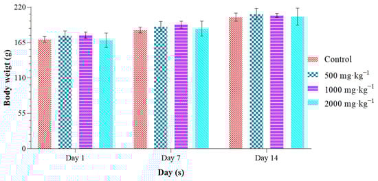 During the experiment, the rats were provided with hydration and daily food in equal quantities. Additionally, signs of toxicity, such as changes in coat, motility, tremors, changes in body weight (mass), food intake, grooming, respiration, stool appearance, mobility, and respiration, as well as convulsions and deaths, were noted during the few hours after gavage and then daily for 14 days.