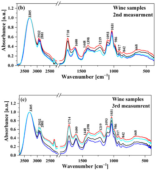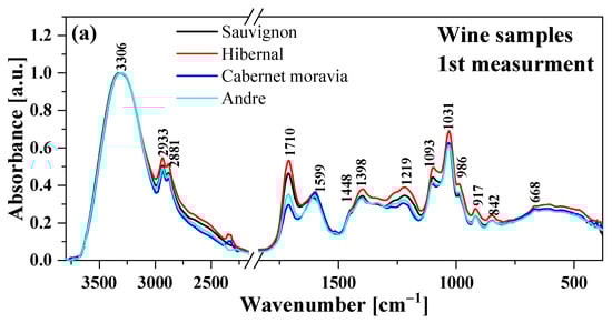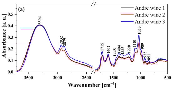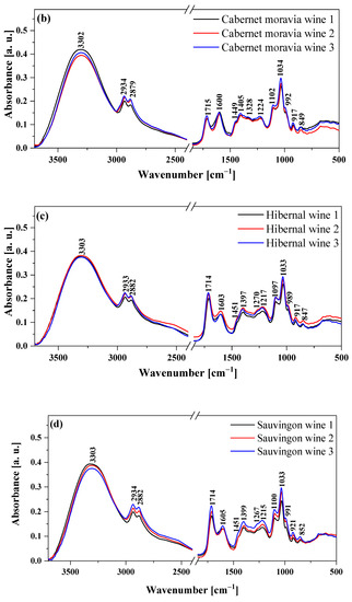 The FTIR spectra of the wines examined showed absorption bands at various frequencies that were related to the presence of various functional groups that constitute the chemical compounds present in food samples, such as alcohols, phenols, aldehydes, higher alcohols, polyols, sugars and amino acids [32]. All the selected samples had a very broad band in the range of 3800–3000 cm−1, resulting mainly from the stretching vibrations of hydroxyl groups, ν(-OH), present in water, alcohol or phenol molecules. The characteristic water absorption bands were present at approximately 990 and 1460 cm−1 (stretching and deformation related to the third overtone of these bands) and characteristic deformation bands with maxima at approximately 1600 cm−1 [33].