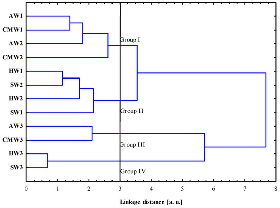 HCA was performed on the FTIR spectra to identify similarities or dissimilarities between the considered wine samples. Figure 3 shows the dendrogram obtained from the four wine samples measured at three different times (1—August, 2—October and 3—November). Considering the cut-off of 3.0 dissimilarity units, four clusters were distinguished. The first cluster (Group I) was formed by two types of wine samples (André and Cabernet Moravia measured during 1 and 2 dates), while the second cluster also contained two types of wine samples (Hibernal and Sauvignon measured during 1 and 2 dates). The third and fourth clusters were similar to the first and second clusters but contained samples measured in November. This result suggests that Andre and Cabernet wines as well as Hibernal and Sauvignon wines have physicochemical properties more similar to each other. The hierarchical cluster analysis showed that the placement of the wine samples on the dendrogram depended on the grape variety and sample measurement date during storage.