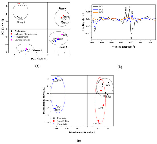In this study, we attempted to establish a classification model of four different wines originating from two white grape varieties (Sauvignon Blanc and Hibernal) and two blue grape varieties (André and Cabernet Moravia) based on their unique fingerprint regions in spectroscopy (FTIR) associated with multivariate analysis (PCA, HCA, PCA-LDA). FTIR analysis showed significant differences between the types of wine examined, particularly within the range of 1540–1780 cm−1. Analysis of the PCA loading plots confirmed that the greatest influence on the classification of different samples of wine was attributed to the 1730 cm−1, 1105 cm−1, 1034 cm−1 and 992 cm−1 bands, specific to stretching vibrations of C-O, C=O and O-H groups in the sugars and organic acids.