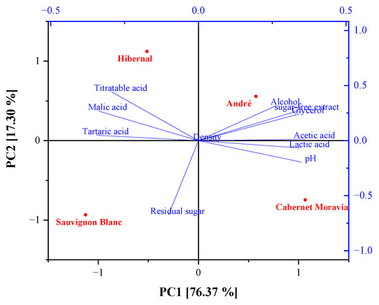 PCA was performed on the basic physicochemical parameters, corresponding to Table 1, in order to gain insights into the relationship between the analytical data and wine quality. Figure 5 shows a biplot that can be used for the visualization of the results from PCA, as it combines both the principal component scores of the observations on the principal components and the loading vectors to represent the coefficients of the variables in a single 2D plot. The first two principal components explained 93.67% of the variance. Therefore, only the first two components (PC1 and PC2) were used in the further part of the analysis. André and Cabernet Moravia (two blue grape varieties) were separated on the right side of PC1, while Sauvignon Blanc and Hibernal (two white grape varieties) were separated on the left side of PC1. The tested wines showed significant differences in their basic physicochemical compositions (did not form clusters), which was represented by the second principal component, PC2. André wine was characterized by the highest level of alcohol, glycerol content and sugar-free extracts. Moreover, red wines displayed higher lactic and acetic acid content as well as pH compared to white wines. In the case of white wines, they were characterized by higher content of malic, tartaric and titratable acids in relation to red wines. However, there were visible differences in the content of these acids between the two white grape varieties (Sauvignon Blanc and Hibernal). The presented PCA analysis shows that the type of wine (grape variety) and the botanical origin are two factors affecting the quality of wines. Nevertheless, the presented data focus only on the basic physicochemical parameters of the investigated wines. Therefore, in the future, the use of complementary analytical methods should be considered in order to obtain more knowledge of the wines’ quality.