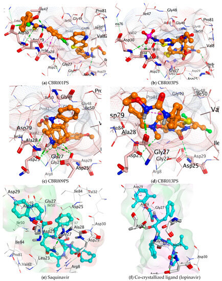 Table 2 provides the important protease–inhibitor hydrogen bonds observed in the crystal structures of CBR001PS, CBR003PS, CBR009PS and CBR013PS, including those mediated by water molecules. The table also shows the hydrogen bonding distances observed in these four crystal structures. Both CBR001PS and CBR013PS form hydrogen bonds with either of the two catalytic residues, Asp25 and Asp25′, in the floor of the active site, as well as other conserved amino acid residues (Gly27, Asp29, Asp30, and Gly48) within the active binding site of the protease. Detailed information regarding these specific chemical interactions can be found in Table 2.