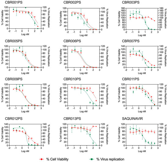 Analysis of selective antiviral activity of CBR003PS and CBR013PS in comparison to that of saquinavir. The panel shows the dose–response curves for cytotoxicity (regression lines represented in red) and antiviral activity (regression lines represented in green). The graph depicts the percentage of HIV-1MN replication on the right y-axis and the percentage of cell viability on the left y-axis, both plotted against the logarithmic scale of drug concentration. Each data point represents the mean ± standard error (SE) of six replicates in two independent experiments.