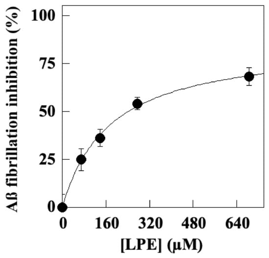 Therefore, we evaluated the ability of LPE to affect molecular interactions of Aβ1–40 amyloid peptides during the aggregation process by an in vitro assay, as detailed in the Methods section. In this assay, the formation of fibrils was performed in the absence or in the presence of increasing LPE concentrations for 24 h. The results (Figure 2) demonstrated that the presence of LPE inhibits the Aβ1–40 aggregation process in a dose-dependent manner. The data interpolated in a hyperbolic behavior allowed the calculation of an IC50 value corresponding to 176.01 ± 7.57 μM.