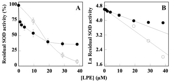 Because the production of ROS contributes either to the impairment of cholinergic and aminergic neurotransmission or formation of the Aβ-amyloid plaques and Tau fibrils, we also evaluated the effect of LPE on SOD enzymes that play a crucial role in the cell system of antioxidant defense. Figure 4 shows the ability of LPE to inhibit both SOD1 and SOD2 activity by in vitro enzyme assay that was performed in the absence or in the presence of increasing concentration of LPE. These results demonstrated the LPE-dependent enzyme inhibition, with a calculated IC50 value corresponding to 21.50 ± 3.20 µM for SOD1 and 10.02 ± 1.30 µM for SOD2. Although both enzymes show a similar sensibility to LPE inhibition, the inactivation profile showed by SOD2 could suggest a co-operative inhibition mechanism.