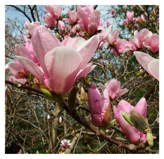 Magnolia × soulangeana is a plant hybrid of M. denudata Desr. and M. liliiflora Desr., which derives its name from French botanist Étienne Soulange-Bodin, who successfully crossed the two aforementioned species in the early 19th century. A large number of hybrid cultivars were later obtained from M. soulangeana, among them a variety called ‘Lennei’ with beautiful pear-shaped white and pink flowers (Figure 1). According to The World Flora Online [1], the genus Magnolia L. (Magnoliaceae) includes 338 subordinate taxa that are trees or shrubs particularly widely distributed in Southeast Asia (China) and the tropical regions of Southwestern North America and Central America. Unlike most wild magnolias, M. soulangeana var. ‘Lennei’, being a hybrid species developed in Europe, is particularly common on this continent (except in Scandinavia) as an ornamental tree in parks and gardens that tolerates low winter temperatures relatively well, so it is popular in cultivation.