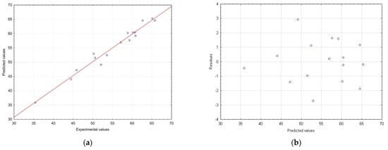 All statistical analyses used in RSM modelling (experimental design and regression analysis of the experimental data) were performed using Statistica 13.3.0 (TIBCO Software Inc., Palo Alto, CA, USA). Linear and quadratic effects and two-way interaction models were also selected for the statistical evaluation. Model adequacy was evaluated using the lack of fit, as well as the coefficient of determination (R2), as obtained from the analysis of variance (ANOVA). In addition, the correlations between the values observed vs. predicted values and graphically evaluated residuals vs. predicted values were assessed.