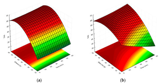 Multivariate optimization methods used in RSM have currently been used extensively in both plant and food analysis. Recently, the most popular are central composite, Box–Behnken, and three-level factorial designs [24]. Table 1 shows the results of our experiments based on the CCD. Within the range of the established UAE parameters, the extraction time (4.77–55.23 min), ethanol concentration (16.36–83.64%), and solvent-to-raw-material ratio (13.18–46.82 mL/g) were analysed. In relation to the aforementioned conditions, different total phenolic contents (TPCs) and DPPH• scavenging activities were observed for the individual MSL extracts obtained.
