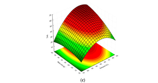 The literature data indicate that, besides the temperature, the extraction parameter that mainly affects the TPC content is ethanol concentration. Tabaraki and Nateghi [26] obtained the highest TPC content (6.05 and 6.21 mg GAE/g dry weight for the predicted and experimental values, respectively) by extracting rice bran with 67% ethanol at 54 °C for 40 min. The optimal high ethanol concentration (59%, V/V) in the RSM-monitored experiment was also estimated for the maximum phenolic yield (the predicted value of 157.35 mg GAE/g has been documented versus the experimental result of 149.12 mg GAE/g, calculated on a dry-weight basis) during a 25 min UAE of pomegranate peel at 80 °C, using a plant-material-to-solvent ratio of 1:44 [27].