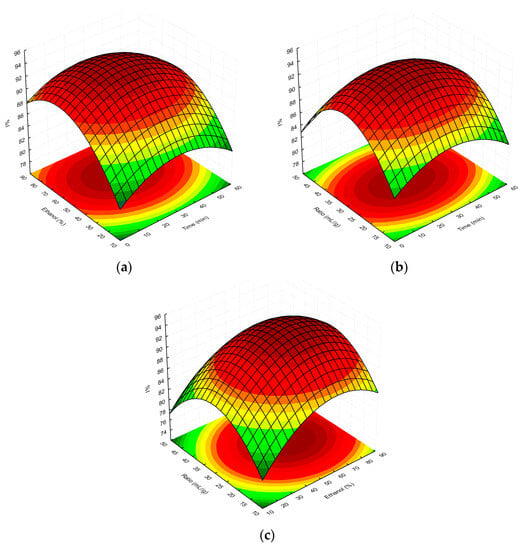 Surface plot showing the effect of ethanol concentration vs. extraction time (a), extractant-volume-to-plant-material ratio vs. extraction time (b), and extractant-volume-to-plant-material ratio vs. ethanol concentration (c), respectively, on %I determined for MSL extracts. The red and green colours in the graph indicate the highest and lowest %I values, respectively.