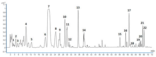 Base peak chromatogram (BPC) showing polyphenolic compounds identified in MSL flower buds using LC/ESI-QToF/MS-MS method in negative-ionisation mode; numbering of individual components according to Table 4.