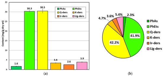 The mean content (mg/g dry wt.) of polyphenolic antioxidants in MSL flower buds (a) and the percentage ratio of individual components in total polyphenolic content quantified in this herbal substance (b). Explanations: PhAs—phenolic acids; PhEts—phenylethanoids; Q-ders—quercetin derivatives; K-ders—kaempferol derivatives; Ir-ders—isorhamnetin derivatives; Lig-ders—lignan derivatives.