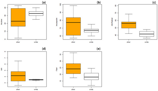 Box plot diagrams of (a) amylose, (b) amylopectin, (c) antiradical activity (%), (d) ash and (e) fiber contents (g/100 g) along with the white and colored millet samples.