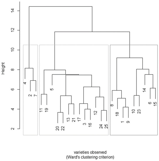 Therefore, a Hierarchical Cluster Analysis (HCA) was conducted on all parameters. To inspect the existence of millet varieties with similar properties. HCA is a multivariate statistical method (frequently used in data mining) that allows verifying the existence of natural groupings inside a set of available observations (identified by the values of some measured features). Groups are formed iteratively, by successively joining or splitting groups of observations. We follow the agglomerative strategy in which each observation starts in its own single group, and groups are successively paired until forming the largest possible one identified by the whole set of available observations. Observation closeness was calculated on the basis of the Euclidean distance, and the Ward hierarchical agglomerative method was used as grouping criteria in order to obtain the minimum variance between the observations that comprise each group.