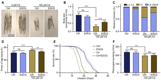 Epigallocatechin-3-gallate (EGCG) reduced the developmental toxicity of Cd-induced C. elegans. (A) Micrographs of nematodes treated with 100 μM Cd or/and 400 μM EGCG for 3 d from larval stage L1. (B) Body size of the nematodes treated with 100 μM Cd or/and 400 μM EGCG for 3 d from larval stage L1. Body size was normalized to the control without Cd or EGCG treatment. (C) Quantification of different developmental stages of nematodes treated for 48 h from L1 with 100 μM Cd or/and 400 μM EGCG. (D) The egg-laying onset was measured by intervention at 48 h with 100 μM Cd or/and 400 μM EGCG. (E) Survival curve intervention at 3 days from L1 with 100 μM Cd or/and 400 μM EGCG. (F) Pharyngeal pumping intervention at 3 days from L1 with 100 μM Cd or/and 400 μM EGCG, n ≥ 30. One-way ANOVA and Tukey post hoc tests were used to assess significance: ** p < 0.01, *** p < 0.001, ns = no significance.