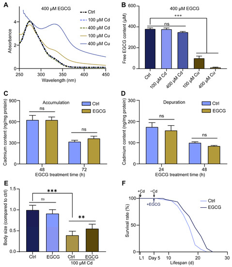 Detoxification of body size developmental toxicity by EGCG is not related to its chelating effect. (A) UV-Vis spectra of 400 μM EGCG treated with 100 or 400 μM Cd and Cu for 4 h in M9 medium. (B) Free EGCG content of 400 μM EGCG treated with 100 or 400 μM Cd and Cu for 4 h in M9 medium measured by HPLC. (C) The accumulation of Cd treated in C. elegans with EGCG (0 or 400 μM) was measured using ICP-MS. (D) The Cd content in L1 nematodes treated first with 100 μM Cd for 48 h and then with EGCG (0 or 400 μM) for 24 or 48 h. (E) Body size of L1 nematodes treated with Cd (0 or 100 μM) for 48 h and then with EGCG (0 or 400 μM) for 48 h. Body size was normalized to the control without Cd or EGCG treatment. (F) Survival curves of L1-stage wild type (WT) nematodes treated first with 100 μM Cd for 5 d and then with EGCG (0 or 400 μM). One-way ANOVA and Tukey post hoc tests were used to assess significance: ** p < 0.01, *** p < 0.001, ns = no significance.