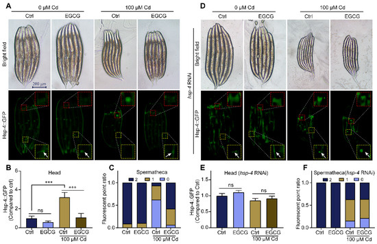 Cd induces ER stress and activates the endoplasmic reticulum unfolded protein response (UPRER) [26]. To test the effect of EGCG on ER stress under Cd exposure, we used the hsp-4p::GFP strain as a reporter gene [27]. While the overall expression of hsp-4p::GFP was minimally affected by Cd and EGCG (Figure 3A), there was a significant difference in its expression in the head region of the nematode. Additionally, Marcella Calfon et al. showed that in the absence of drug treatment, there is constitutive hsp-4p::GFP expression in both spermathecae (Figure S3A). In a Cd-free environment, EGCG had little effect on the expression of hsp-4p::GFP. However, exposure to Cd induced hsp-4p::GFP expression in the nematode head and suppressed expression in the spermathecae. Supplementation with EGCG significantly suppressed the expression of the hsp-4p::GFP in the nematode head and appeared to partially restore the expression in the spermathecae (Figure 3A–C). Interestingly, hsp-4 RNA interference (RNAi) induced the expression of hsp-4p::GFP (Figure 3D). Furthermore, when subjected to hsp-4 RNAi, Cd was unable to induce ER stress in the nematode head, and EGCG lost its ability to inhibit ER stress in the nematode head and increase the expression in the spermathecae (Figure 3D–F).