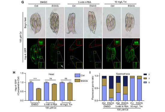 To further confirm the modulatory effect of EGCG on ER stress under Cd exposure, we treated hsp-4p::GFP nematodes with 4-phenylbutyric acid (4-PBA), which inhibits ER stress by accelerating protein folding. Our findings indicated that even after supplementation with 4-PBA in a Cd-free environment, EGCG still had no effect on the expression of hsp-4p::GFP in the head or spermathecae (Figure S3B–D). Under Cd exposure supplemented with 4-PBA, we observed no significant difference in ER stress between the EGCG-treated and control groups, either in the head or in the spermathecae (Figure 3G–I). In addition, we treated the nematodes with tunicamycin (Tm), an ER stress inducer. We observed a significant increase in hsp-4p::GFP expression in the head after supplementation with Tm in a Cd-free environment, and this increase could not be suppressed by EGCG. Furthermore, the expression in the spermathecae was significantly reduced, with no significant difference observed between the EGCG-treated and control groups (Figure S3B–D). Under Cd exposure supplemented with Tm, no significant difference in the expression of hsp-4p::GFP in the head was observed between the EGCG-treated and control groups; the same was true for the expression in the spermathecae (Figure 3G–I). Overall, our data suggest that EGCG has a differential effect on ER stress in nematodes under Cd exposure, inhibiting ER stress in the head region and inducing ER stress in the spermathecae.