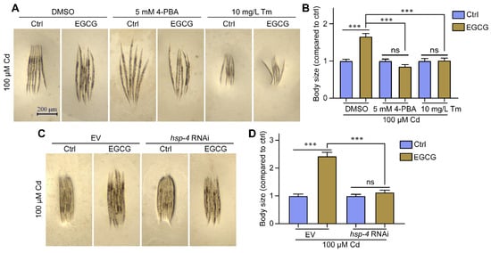EGCG attenuates Cd-induced body size developmental toxicity by regulating ER stress. (A) Micrographs of WT worms supplemented with DMSO, 5 mM 4-PBA, or 10 mg/L Tm. (B) Body size of WT worms supplemented with DMSO, 5 mM 4-PBA, or 10 mg/L Tm. Body size was normalized to control without EGCG treatment. (C) Micrographs of WT worms grown on EV or hsp-4 RNAi; (D) body size of WT worms grown on EV or hsp-4 RNAi. Body size was normalized to control without EGCG treatment. L1-stage nematodes treated with Cd (100 μM) and EGCG (0 or 400 μM) for 3 d. One-way ANOVA and Tukey post hoc tests were used to assess significance: *** p < 0.001, ns = no significance.