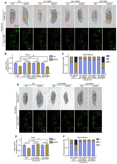 Eif-2α and atf-4 are found downstream of PERK, and these genes are homologous to nematode eif-2α, atf-4, and pek-1, respectively. In the Cd-free environment, EGCG treatment in the eif-2α RNAi group slightly increased hsp-4p::GFP expression in the head but had no effect on expression in the spermathecae, while in the atf-4 RNAi group, EGCG treatment caused no significant difference in hsp-4p::GFP expression in the head and spermathecae (Figure S5D–F). Under Cd exposure, EGCG did not affect hsp-4p::GFP expression in the head and spermathecae in the eif-2α RNAi and atf-4 RNAi groups compared to the control (Figure 5D–F). Overall, these results suggest that EGCG regulates Cd-induced ER stress through the pek-1/eif-2α/atf-4 pathway.