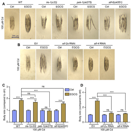 EGCG attenuates Cd-induced body size developmental toxicity via the pek-1/eif-2α/atf-4 pathway. (A) Micrographs of WT, ire-1 (v33), pek-1 (ok275), and atf-6 (ok551) nematodes. (B) Micrographs of WT worms grown under EV, eif-2α RNAi, or atf-4 RNAi. (C) Body size of WT, ire-1 (v33), pek-1 (ok275), and atf-6 (ok551) nematodes. Body size was normalized to control without EGCG treatment. (D) Body size of WT worms grown under EV, eif-2α RNAi, or atf-4 RNAi. Body size was normalized to control without EGCG treatment. L1-stage nematodes treated with Cd (100 μM) and EGCG (0 or 400 μM) for 3 d. One-way ANOVA and Tukey post hoc tests were used to assess significance: *** p < 0.001, ns = no significance.