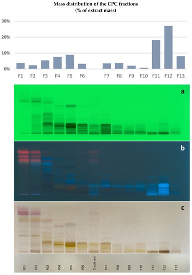Mass distribution and HPTLC profile of the 13 CPC fractions (F1–F13 and crude extract—(a) 254 nm; (b) 366 nm; (c) Visible after vanillin/H2SO4 reagent spraying).