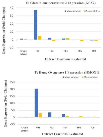 A total of 13 fractions were obtained from the crude F. ulmaria extract. The secondary metabolite distribution in the fractions is illustrated in Figure 1. Fractions F01, F03, F04, F06, and F09 were then subjected to epidermal gene expression-modulation tests in the Normal Human Epidermal Keratinocytes for epidermal proliferation, differentiation, barrier function, epidermal renewal, and stress response. Fractions F02, F05, F07, F08, F10, F11, F12, and F13 were not subjected to these tests due to the paucity of the fractions. Fractions F01, F03, F04, F06, and F09 were evaluated at the maximal concentration of 1 g/L and at the minimal dose of 0.2 g/L; the modulation of gene expressions is shown in Figure 3.