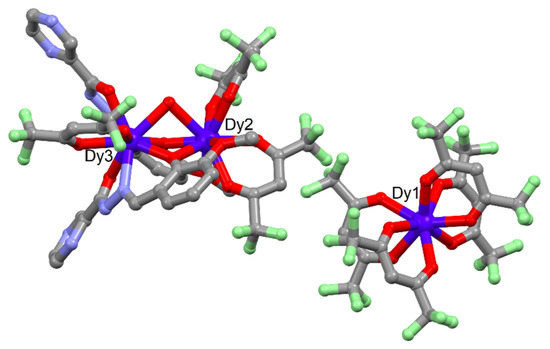 [Dy2(hfac)3(H2O)(Hopch)2]·[Dy(hfac)4] (1). 1 crystallizes in the monoclinic space group P21/n (N°14) (Figure 1, Supplementary Materials Figure S1, Table S1). The asymmetric unit is composed of one mono-cationic dinuclear complex, [Dy2(hfac)3(H2O)(Hopch)2]+, and one mono-anionic mononuclear complex, [Dy(hfac)4]−.