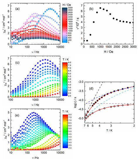 The best-fitted curves are represented in Figure 6d for C = 246.2(74) K−n s−1 with n = 3.11(16) and τTI = 6.62(35) × 10−5 s, where C and n are constant parameters for the Raman relaxation process and τTI is the thermal independent relaxation time of the QTM. One could notice that the n constant parameter is lower than the expected n value for Kramers’ ions. Indeed, such a parameter value should be nine [29], but it is well known that, for molecular systems, lower values comprised between 2 and 7 could be found in the presence of both acoustic and optical phonons [30,31,32]. In order to enhance the magnetic performance of 1, the QTM could be cancelled by applying an external dc field [33]. Thus, the field dependence of the magnetic susceptibility is studied (Figure 6a,b and Figure S8) and the relaxation time is extracted using the extended Debye model (Table S3). The application of a small magnetic field (<1000 Oe) led to the increase of the magnetic relaxation time (τ) (Figure 6b) due to the cancelling of the QTM, while, for a higher magnetic field value, τ decreases due to the direct process activation. To keep a significant χM″ signal intensity, an 800 Oe value was selected. Under an applied field of H = 800 Oe, 1 highlighted a frequency dependence of the magnetization (Figure 6e and Figure S9). Both in-phase and out-of-phase signals of the magnetic susceptibility can be analyzed in the framework of the extended Debye model [26,27,28]. The temperature dependence of the relaxation time is plotted and depicted in Figure 6d (Table S4). At H = 800 Oe, it was determined by analyzing the normalized Argand (Figure S10) that more than 90% of the sample was involved in the slow magnetic relaxation. The thermal variation of the relaxation time could also be fitted considering a combination of Orbach and Raman processes. The best fit was obtained with τ0 = 1.50(16) × 10−7 s, Δ = 32.1(7) K and C = 496.3(26) K−n s−1 with n = 1.83(6), where τ0 and Δ are the relaxation time and the energy barrier of the Orbach relaxation process (Figure 6d). One could remark that the 800 Oe external applied dc field cancelled efficiently the QTM and both Raman processes in 0 (light blue dashed line) and 800 Oe (dark blue dashed line) are similar as expected since such a process is field independent. It is also worth noticing that the Orbach process might be involved in the zero applied dc field but is almost negligible compared to the Raman and QTM processes, making it difficult to determine the relevant parameters for it.