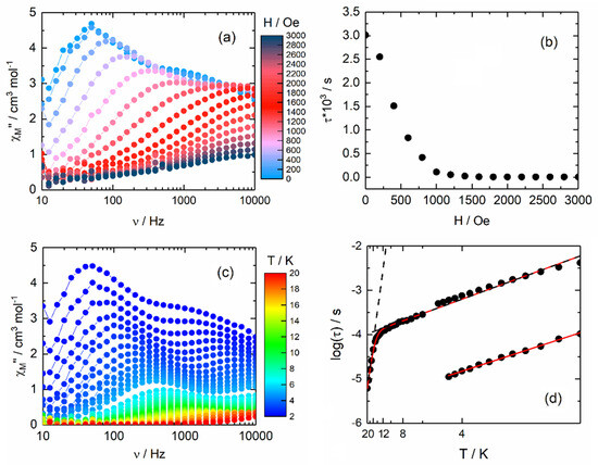 On the contrary, the two compounds 1 and 2 displayed a slow magnetic relaxation in the zero applied dc field (Figure 6a and Figure 7a). One of the possible explanations for the difference in magnetic behavior between 1 and 2 and 3 and 4 might be the lack of ferromagnetic interactions in 3 and 4. A frequency dependence of the magnetic susceptibility in the temperature range of 2–8 K in the 100 Hz–10 kHz frequency window of the oscillating field was also observed at zero dc magnetic field for 1 (Figure 6c and Figure S6). An extended Debye model was used to extract the relaxation time (τ) [26,27,28] (Table S2), fitting simultaneously the two in-phase (χM′) and out-of-phase (χM″) components of the magnetic susceptibility. Furthermore, the Argand plot confirms that the observed slow magnetic relaxation corresponds to more than 90% of the sample (Figure S7). The corresponding thermal variation of the log(τ) is depicted in Figure 6d and could be fitted using the following equation (Equation (1)) for which the Orbach contribution was neglected:
