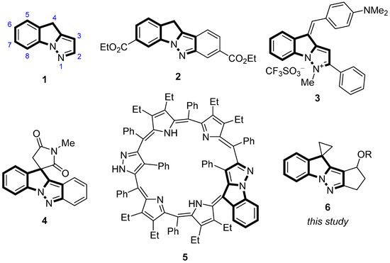 Pyrazolo[1,5-a]indole, a condensed type of pyrazoloindole, has three possible isomers. The 4H-Pyrazolo[1,5-a]indole (1, Figure 1) is the most stable isomer as the 1H-isomer is isoelectronic to azulene [1,2], and the 3H-isomer is readily converted to 1 [3,4]. As a result, pyrazoloindole 1 and its derivatives are more frequently reported. Representative examples using 1 as their scaffold or substructure are also 199shown in Figure 1, including diester 2 with a benzo-fused structure [5], salt 3 substituted with an exocyclic 4-methylene [6,7,8], benzo-fused 4 with a 4-spirosuccinimide [9], and Siamese-twin-type porphyrin 5 [10]. Among them, compound 3 shows potent anti-cancer activity through inhibiting topoisomerase I [2], and compound 5 has an interesting folded structure [10].