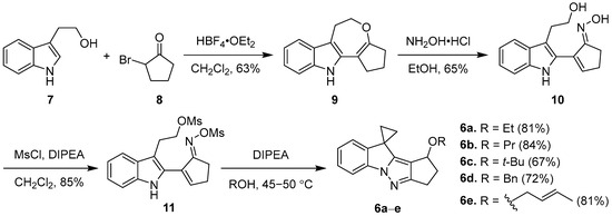 We are interested in synthesizing novel heterocyclic compounds as they are often biologically active and possibly developed as pharmaceuticals [20]. In our discovering indolo[3,2-c]quinolinones as topoisomerase-I inhibitors [21], we found that spirocyclopropane-containing 4H-pyrazolo[1,5-a]indoles 6a–e could be readily prepared from indole–O-(methylsulfonyl)oxime 11 through double cyclization reactions (Scheme 2). Substrate 11 was synthesized from tryptophol (7) and 2-bromocyclopentanone (8) through intermediates 9 and 10. Compared with the synthetic methods from the literature (Scheme 1), our method has the advantage of using simple starting materials (indole and cycloalkanone) and avoiding the use of expensive or toxic metal catalysts to form 6a–e having complex structures in good yields. In addition, 6a–e are new compounds and have a characteristic cyclopropyl fragment that frequently appears in preclinical/clinical drug molecules [22], which might render them biologically active. Furthermore, the functional groups in 6a–e, such as the alkoxy and spirocyclopropane, could further be modified to give derivatives with more diverse substituents.