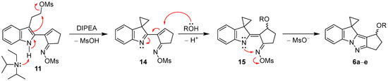 Mesylation of 10 with methanesulfonyl chloride (MsCl) and N,N-diisopropylethylamine (DIPEA) in CH2Cl2 afforded indole–O-(methylsulfonyl)oxime 11 (85% yield, Scheme 2), which was then reacted with various alcoholic solvents to afford the target spirocyclopropane-containing 4H-pyrazolo[1,5-a]indoles 6a–e. Ethoxy analog 6a was generated with an 81% yield. Propoxy analog 6b had a better 84% yield. Tert-butoxy analog 6c and benzyloxy analog 6d showed slightly reduced yields (67% and 72%). The reaction of 11 with (E)-but-2-enol afforded the target 6e an 81% yield with the retention of the trans configuration in the alkoxy group. When DIPEA for the reaction was replaced with secondary amines (e.g., Me2NH, Et2NH), a messy mixture was formed without the expected amino product. This might come from the reaction of the strong nucleophilic amines with the O-(methylsulfonyl)oxime or the cyclopropane moiety, which would result in the formation of multiple by-products.