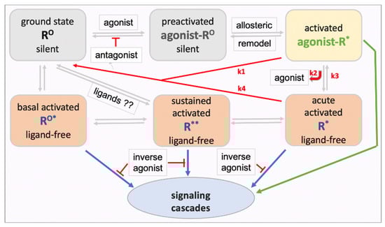 Schafer et al. [47] have modified this rhodopsin model by including sustained ligand-free signaling after ATR dissociation, testing conformational dynamics with the use of time-resolved, fluorescence labeling experiments. They concluded that “an active-like, yet empty, receptor conformation can transiently persist after retinal release, followed by ATR rebinding, before the receptor ultimately collapses into an inactive conformation.” These observations support the receptor model with an agonist-R*—R* equilibrium (Figure 1). Their results further indicate that congenital blindness caused by constitutively active rhodopsin [64] might be treatable with inverse agonist drugs that disrupt the rebinding of ATR to active rhodopsin. Schafer et al. [47] further comment that continued ligand-free signaling after agonist dissociation could play an unappreciated role with other GPCRs as well.