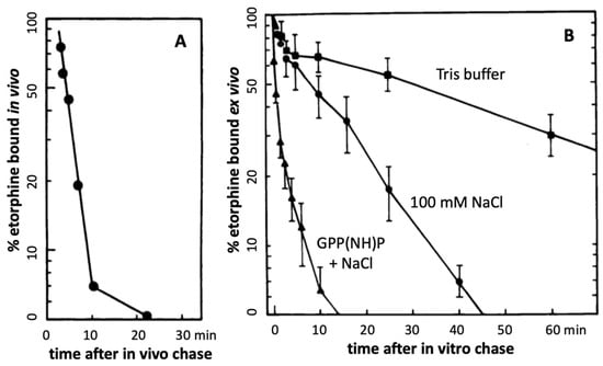 Rapid etorphine receptor dissociation in rat brain (adapted from Perry et al., 1982 [58]). A tracer dose of 3H-etorphine was injected s.c., labeling preferentially MOR sites, with ~50% of 3H-etorphine in the brain specifically bound at 17 min (time 0). At this time, a saturating chase dose of diprenorphine was injected, with sacrifice at the indicated time points, rapid brain homogenization, and analysis of bound 3H-etorphine (A). In panel (B), the animals are sacrificed at 17 min and saturating chase concentrations of etorphine are added in vitro (B). The in vitro chase experiment was performed in Tris buffer alone and with addition of 100 mM NaCl or 100 mM NaCl + GPP(NH)P (stable GTP analog) [58]. These results demonstrate rapid etorphine dissociation from MOR only under physiological conditions in vivo or immediately after sacrifice in the presence of NaCl + GPP(NH)P.