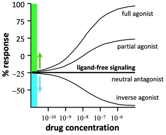 Ligand effects at a receptor displaying ligand-free signaling. Physiological changes and drug exposure can decrease or enhance basal ligand-free signaling (set at 0). Thus, a neutral antagonist can turn into a partial agonist or inverse agonist, depending on its efficacy at each of the receptor states (adapted from [29]).