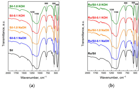 The textural properties of the supports and catalysts were characterized by the low-temperature nitrogen adsorption–desorption measurements. The modification of silicalite-1 with low-concentration alkali solutions resulted in an increase in specific surface area (SSA) and total pore volume, whereas modification with a more highly concentrated solution caused a decrease in these values (Table 1). The alkaline treatment of silicalite-1 also led to an increase in mesoporosity (mesopore surface area (Sext) and volume (Vmeso)), accompanied by a loss of microporosity (Vmicro). The exception is sample Sil-1.0 KOH, which shows a decrease in mesoporosity compared to the mesoporosity of the unmodified sample. This could be a result of higher degradation of the structure by modification with 1.0 M KOH, in comparison to the influence of other solutions on the structure of silicalite-1. The observed decrease in micropore volume for all modified samples is assigned to a loss of crystallinity, which is in agreement with XRD and FTIR data [28]. The introduction of the ruthenium phase on the surface of the supports practically did not change the specific surface area and total pore volume. However, differences in microporosity and mesoporosity between catalysts and supports were observed. A decrease in microporosity was observed, accompanied by an increase in mesopores, as a result of further deterioration of the silicalite-1 structure of the supports by chloride ions during the impregnation procedure. The impregnation with the ruthenium phase led to the highest drop in micropore volume on unmodified silicalite-1, whereas the lowest drop (or even no change) was observed for catalysts obtained with supports modified with 1.0 M XOH. These results are in line with the loss of crystallinity of the catalysts compared to the supports, as estimated based on the FTIR data.