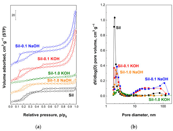 Figure 6 shows the N2 isotherms and the corresponding pore size distribution of the supports. The isotherms of the unmodified silicalite-1, as well as modified samples, exhibit two hysteresis loops. The first one at ~0.2 p/p0 occurs for silica MFI materials and its broadening for samples modified with 0.1 M XOH is a result of the increasing amount of defects formed during alkali modification [22,29]. Such a hysteresis loop does not change for a support modified with a 1.0 M NaOH solution. This is probably due to the low crystallinity of Sil-1.0 NaOH, and the formation of defects in the framework of this sample is balanced by its partial amorphization. In the case of Sil-1.0 KOH, amorphization predominates over defect formation, and, as a result, the low-pressure hysteresis loop disappeared. The second hysteresis loop (p/p0 > 0.45) for the initial sample is attributed to the intercrystalline porosity. The increasing volume of the second loop for the samples modified with 0.1 M XOH is associated with the generation of additional mesoporosity during the applied procedure. It is illustrated by the the pore distribution (Figure 6b) as the additional pores with larger diameters compared to the pores of the starting material. However, for supports modified with 1.0 M alkali solutions, the high-pressure loop disappears due to the connection of the silicalite-1 crystals into more dense, glued agglomerates during modification, as evidenced by SEM analysis (Figure 4d). The N2 isotherms and pore size distributions for the catalysts are similar to those of the supports.