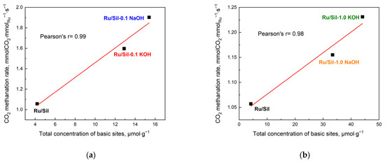CO2 methanation rate as a function of content of basic sites for Ru/Sil 0.1 XOH (a) and Ru/Sil 1.0 XOH (b) catalysts (X = Na or K). Reaction conditions: before reaction all catalysts (25 mg) were reduced in H2 at 500 °C, 30 min; the feed gas composition—H2:He:CO2 = 4:5:1; total flow rate—100 cm3 min−1; Treac = 450 °C.