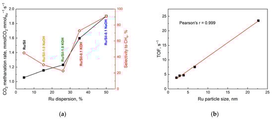 In addition, the activity of the catalysts tested is correlated with the dispersion of the active phase. Figure 12a shows the dependence of apparent rate (rt) and selectivity to CH4 on ruthenium dispersion. The catalyst with the best dispersion (Ru/Sil-0.1 NaOH) shows the highest activity. This seems to be a logical conclusion because the high dispersion of ruthenium provides a large number of active centers. Moreover, the same catalyst is also the most selective to methane. Thus, from a practical point of view, the catalyst with the highest dispersion is the right choice.