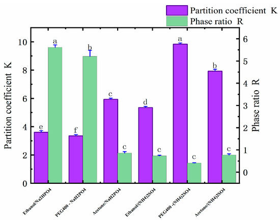 Distribution coefficients (K) and phase ratios (R) of six different ATPSs. Different letters represent significant differences (p < 0.05) between different vertical bars.