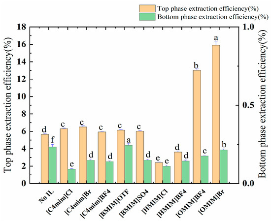 The effect of ILs on the extraction rate of the polyphenols of the top and bottom phases. Different letters represent significant differences (p < 0.05) between different vertical bars.