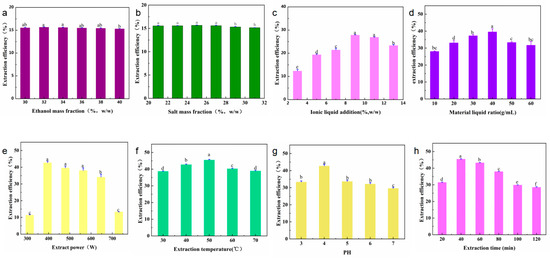 Single factors affecting the yield of A. senticosus polyphenols: (a) ethanol mass fraction (21~31 wt.%), (b) salt mass fraction (30~40 wt.%), (c) ionic liquid addition (3~13 wt.%), (d) material–liquid ratio (1:10~1:60 g/mL), (e) extraction power (311~731 W), (f) extraction temperature (30~70 °C), (g) pH (3~7), and (h) extraction time (20~120 min). Different letters represent significant differences (p < 0.05) between different vertical bars.