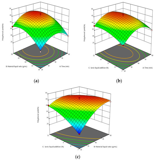 (a) Response surface map of the effects of extraction time and material–liquid ratio. (b) Response surface map of the effects of extraction time and ionic liquid addition. (c) Response surface map of the effect of material–liquid ratio and ionic liquid addition; the vertices indicate the maximum or minimum value of the response variable, while the points on the surface indicate the performance of this response variable at different levels of factors; the change from blue to red indicates a change from less to more the yield of polyphenols.