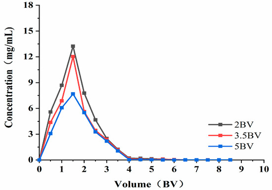 As can be seen from Figure 8, when the elution flow rate was 2 BV·h−1, the highest concentration of solution exited at 1.5 BV. When the elution flow rate was 3.5 BV·h−1, the attention of the effluent at 1.5 BV was the highest (which is similar to that found at 2 BV·h−1), and the elution peaks appeared more concentrated. This indicates that the target product can be eluted more thoroughly at lower flow rates. When the elution flow rate was 5 BV·h−1, the effluent concentration was lower than that of the low flow rate, and the peaks were not concentrated. The possible reason for this was that the elution speed was fast, and the eluent could not fully contact the resin to wash down the polyphenols adsorbed by the resin. As such, the final elution time and effect was set at 3.5 BV·h−1, and the volume used was 4 BV.