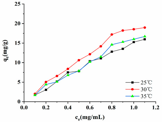 where qe is the equilibrium adsorption amount (mg/g), Ce is the equilibrium mass concentration of a solution (mg/mL), qm is the saturated adsorption capacity (mg/g), KF is the Freundlich equation constants ((mg/g)(mL/mg)1/n), n is the Freundlich equation constants (which can describe isotherm change trends), KL is the Langmuir equation constants (which can be evaluated the amount of adsorption (mL/mg)), KT is Temkin equation constants (mL/mg), and BT is the Temkin equation constants (J/mol).