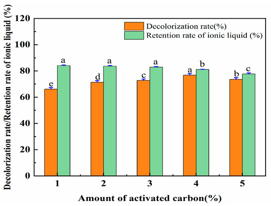 The effect of the amount of activated carbon on the decolorization rate and the retention rate of IL. Different letters represent significant differences (p < 0.05) between different vertical bars.